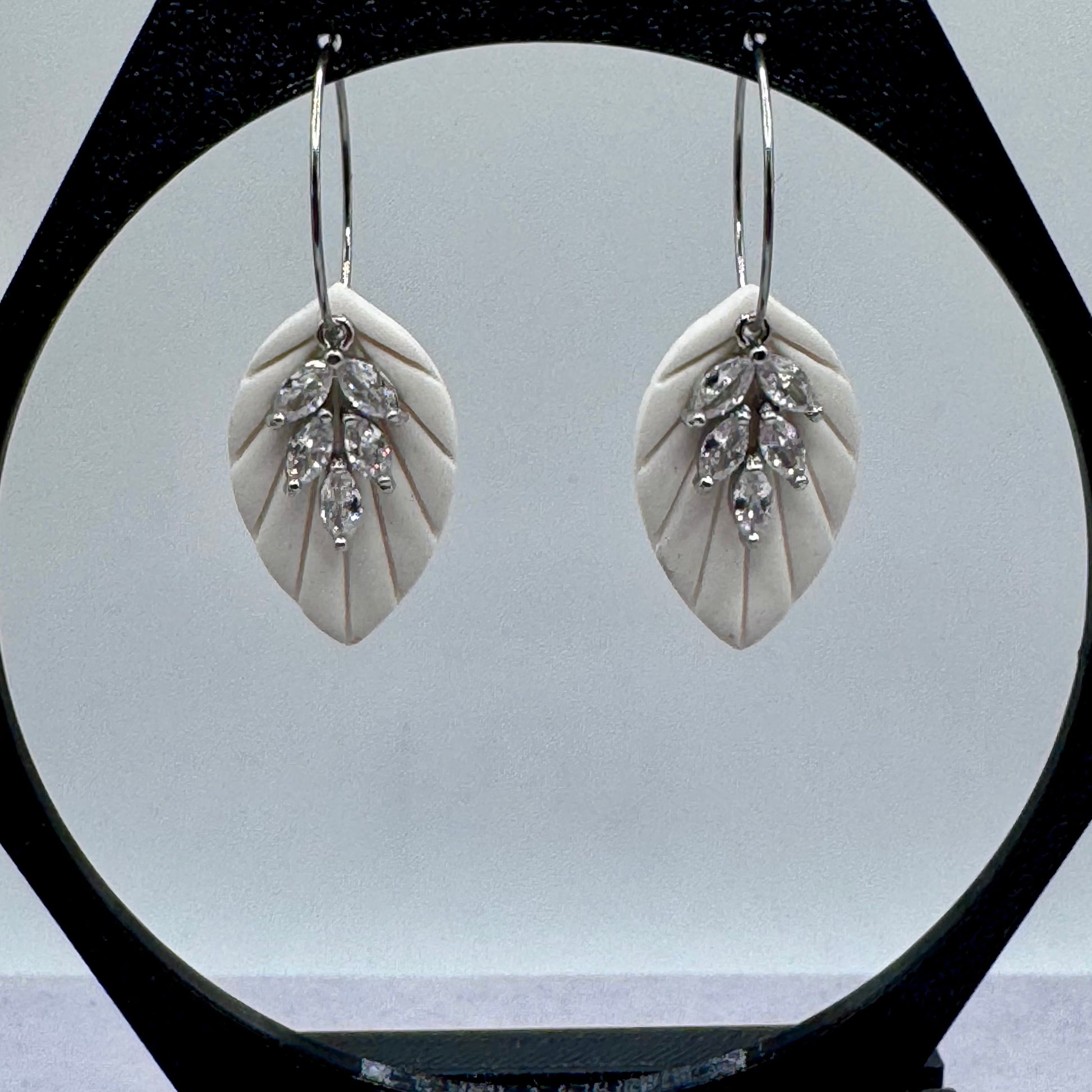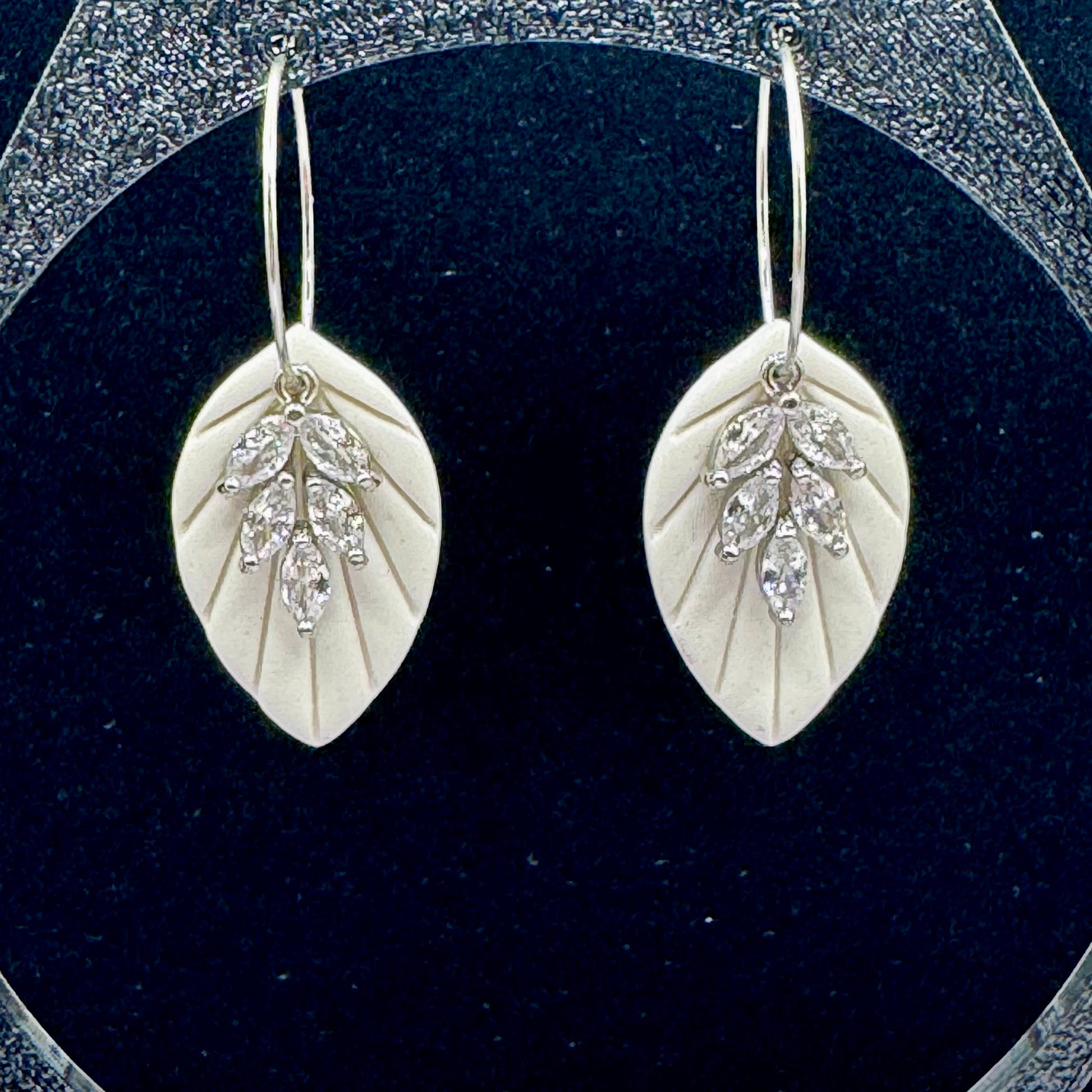 These graceful earrings feature hand-sculpted white clay leaves adorned with sparkling crystal accents that catch the light beautifully. Lightweight yet refined, they bring a touch of nature-inspired elegance to any outfit—from cozy winter gatherings to formal evening events.