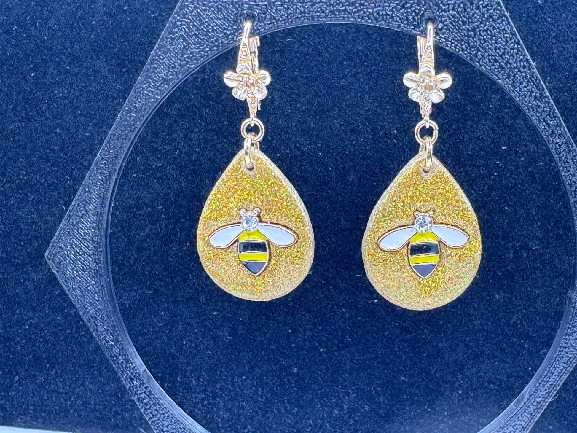 Vibrant golden teardrops with shimmering glitter bases, adorned with enamel honeybees and sparkling accents. Fun, whimsical, and full of sunshine energy — a buzzing little statement piece!