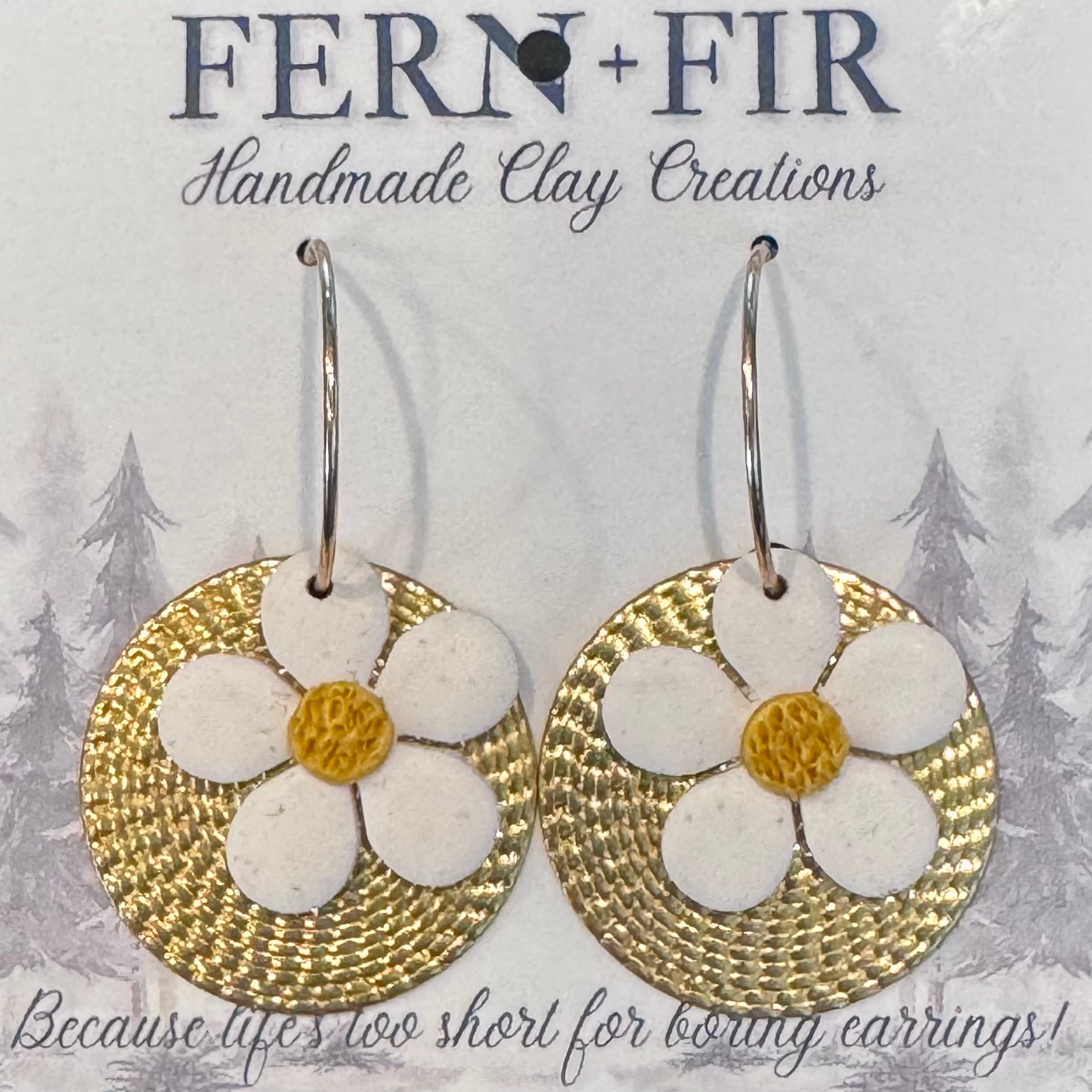 Bright white daisies with golden yellow centers bloom on textured metallic gold discs. Lightweight and playful, these earrings bring sunshine to every outfit. A timeless flower with a modern shimmer.