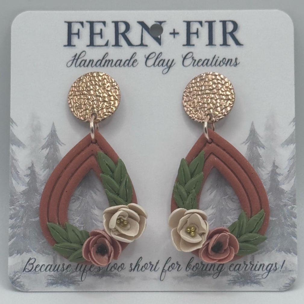 Handcrafted clay earrings featuring warm terracotta arches, delicate greenery, and hand-sculpted roses in soft cream and muted blush. Finished with textured gold studs for just the right touch of elegance. Perfect for cozy fall outfits, holiday gatherings, or anytime you want to bring a little autumn charm to your look.